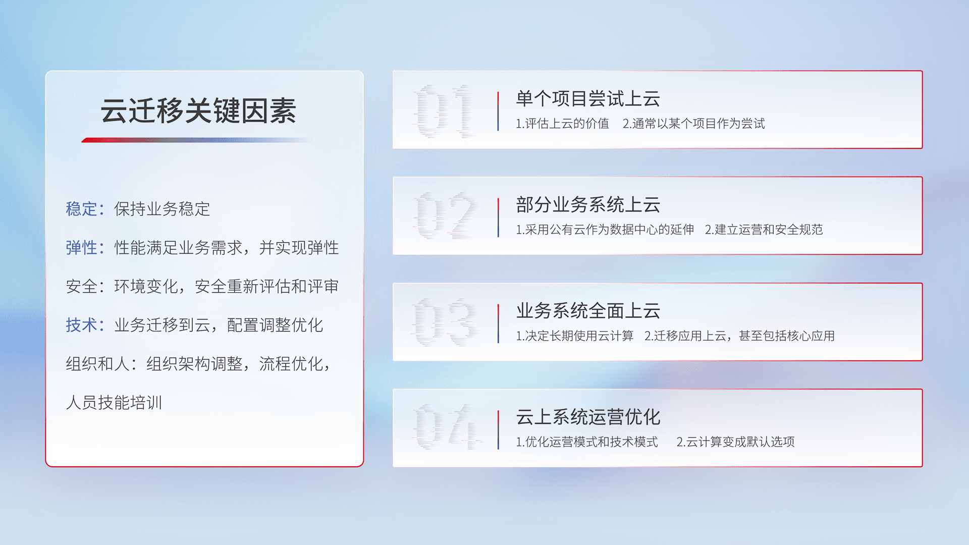 结合实际业务,,,,从规划设计、、云平台选型、、、云原生改造、、数据迁移、、、集成交付,,,,迁移全过程为客户识别最佳上云路径,,,,做好风险识别管理,,,,设计网络架构、、身份权限、、、、安全审计合规、、、、操作审计、、、、日志审计、、、、监控告警策略、、、、多站点容灾设计等,,,,对云上基础设施进行整体规划,,提升IT治理水平,,以满足弹性、、、、高可用、、、高性能的需求。。
