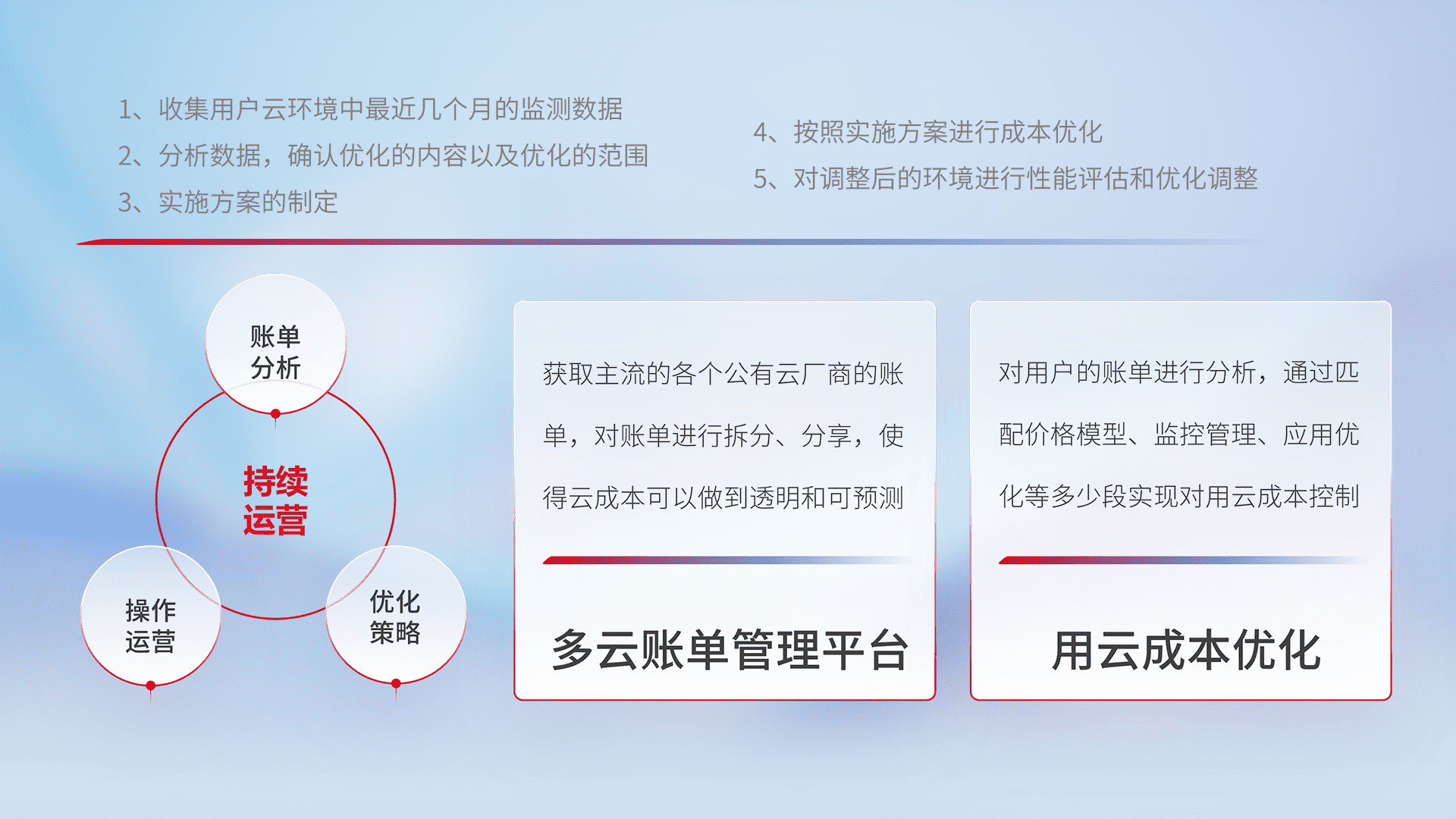 通过多云纳管,,以统一的资源数据模型把客户的云资源进行抽象和封装,,,进而实现对多云资源的统一操作,,,保障云资源管理的可靠性、、、稳定性与可用性。。量身定制化运维内容,,,配置、、开发运维、、、、补丁管理、、、备份、、、监控、、认证和访问管理、、、、审计和日常巡检等,,,保障在用云过程中的可靠度,,稳定度以及高可用率。。。。